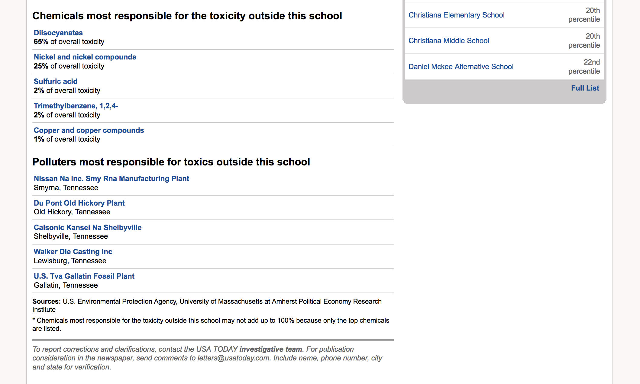The University of Massachusetts researchers used those findings to produce lists of chemicals that contributed to air toxicity at each of the nation's 127,800 schools in 2005, the most recent year for which the EPA has completed its model. With the help of University of Massachusetts researchers and other experts, and after consulting with the EPA, USA Today used those records to create three measures of a school's exposure to industrial toxics: